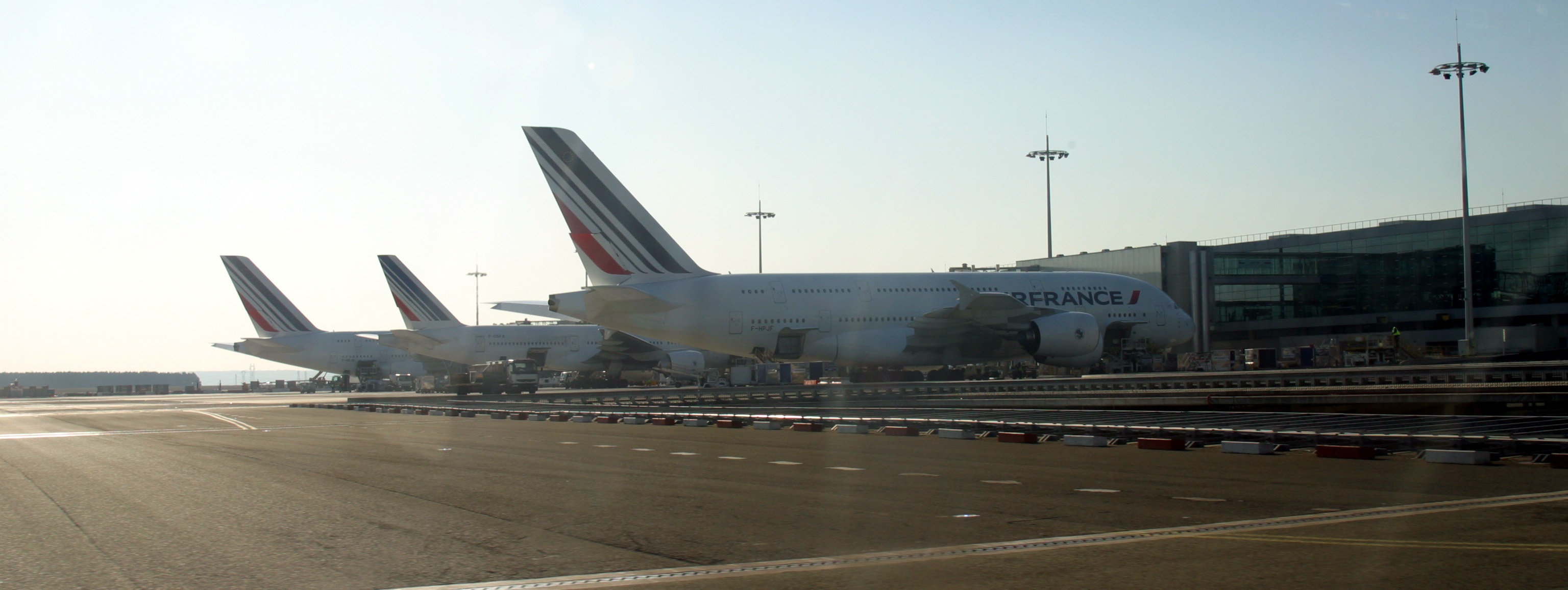 Après la visite du 2E, retour dans le minibus sur le tarmac à la découverte des Satellites 3 et 4 (le 4 est encore en travaux) qui constituent un prolongement du Terminal 2. C’est là notamment que se trouvent les A380 Air France qui ont bien sûr besoin de passerelles d’embarquement spécifiques pour chaque pont.