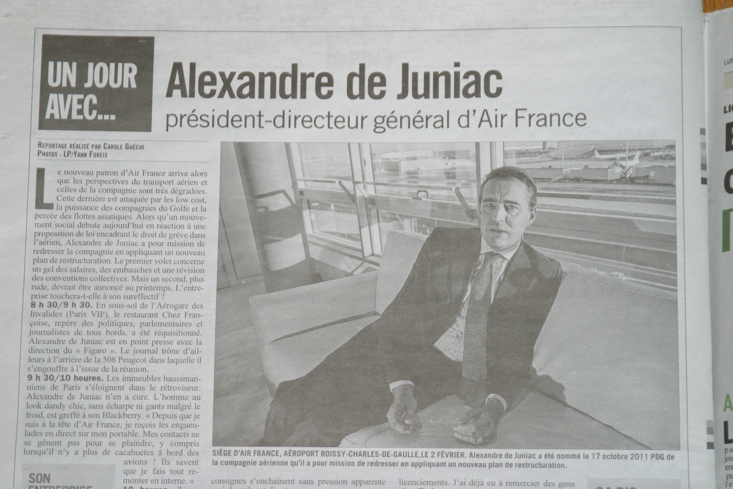 Il est maintenant presque 15h. Marina me propose de monter encore d’un étage, c’est-à-dire au dernier étage, celui de la Présidence. Et là, énorme surprise. Le nouveau PDG de la compagnie, M. Alexandre de Juniac se trouve être non loin de là en compagnie du Directeur du Service de Presse, M. Tréhan. Il est suivi toute la journée d’une journaliste du Parisien qui lui a consacré sa rubrique du lundi « Un jour avec ».