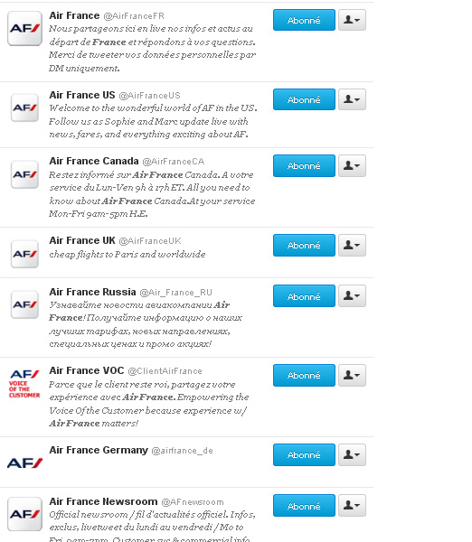 Pourquoi ne pas être présent sur les deux réseaux ? Je vois plusieurs possibilités. Premièrement, la compagnie peut tout simplement manquer de moyens car il faut le dire, gérer les réseaux est particulièrement chronophage et une fois que l’on commence, les abonnés se multiplient et attendent de l’activité. Ensuite, ne pas être présent sur Twitter peut vouloir signifier ne pas chercher à traiter les questions et remarques des clients ou clients potentiels par ce biais-là. Et puis, si on ne maîtrise pas suffisamment la communication par les réseaux sociaux, mieux vaut peut-être s’abstenir par crainte de faire une erreur qui génèrerait un « bad buzz ». Si on sort d’ailleurs quelques instants du cadre du transport aérien, on se rend compte aujourd’hui que si beaucoup d’entreprises disposent de comptes sur les réseaux sociaux, nombreuses sont encore celles qui n’osent pas s’y aventurer à moins de faire appel à des agences spécialisées.