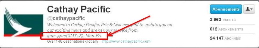 D’autres compagnies en revanche font le choix de donner des horaires d’ouvertures, comme Cathay Pacific, voire de publier un tweet pour annoncer que le compte est ouvert/fermé. C’est une chose que j’ai déjà vu sur le compte de Corsairfly, qui indiquait encore il y a peu des horaires de disponibilité dans sa bio. Celles-ci ont aujourd’hui disparu mais on retrouve encore les anciens messages d’ouverture et de fermeture des comptes (9h-18h en semaine il me semble).