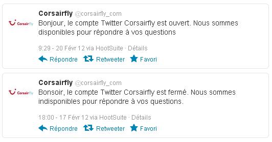 La politique de disponibilité sur Twitter varie d’une compagnie à l’autre. Une grande majorité de compagnies n’indique pas d’horaires d’ouverture dans la bio du compte. C’est plus avantageux en termes de communication puisque ça donne l’impression qu’il y a toujours quelqu’un pour répondre et lire les tweets même si bien évidemment, on se doute qu’il n’y a pas en permanence un Community Manager connecté.