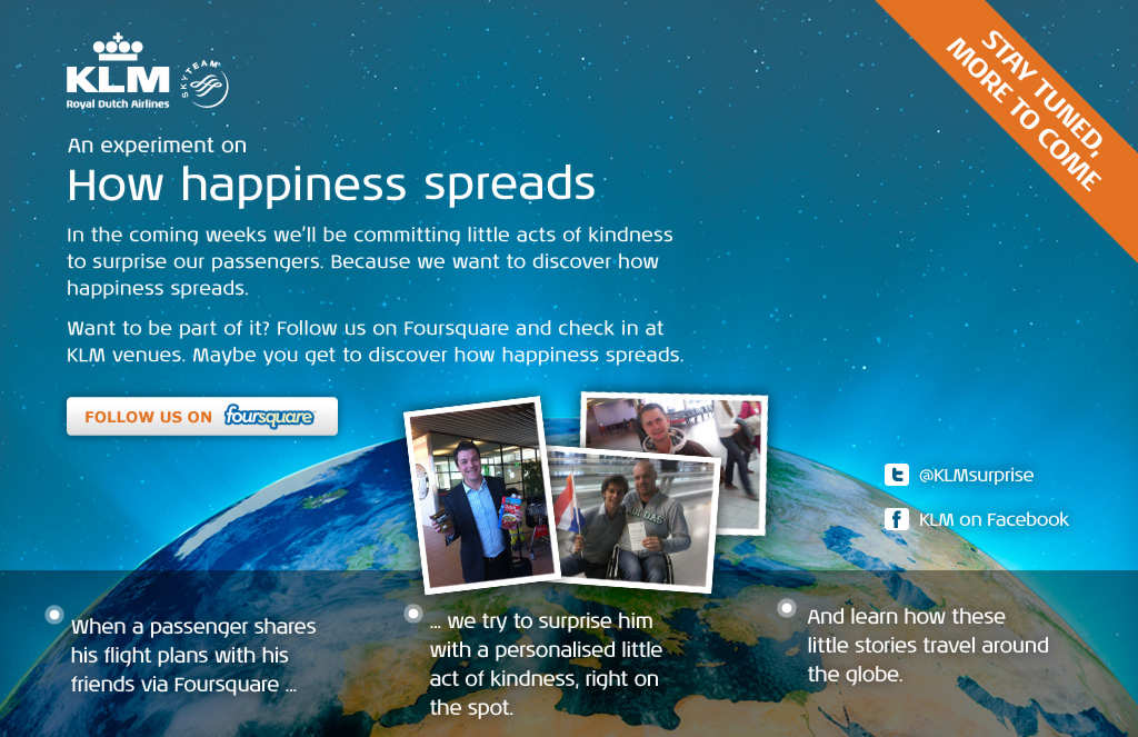 Mais comme dit plus haut, KLM n’en est pas à son coup d’essai. Elle avait fait sensation sur Twitter en affrétant un vol sur mesure après un pari sur Twitter. A l’origine, ce sont un DJ et un réalisateur qui ont protesté sur le réseau social parce qu’il n’existait pas de vol direct Amsterdam – Miami pour aller assister à un festival de musique. KLM les a donc mis au défi de trouver des passagers leur promettant un avion si le vol était rempli, chose faite sur Twitter en moins de 5h avec l’évènement spécial « Fly2Miami ». Le 21 mars 2011, KLM a spécialement affrété un vol direct AMS-MIA ! Et devant ce succès, la ligne est devenue régulière et Miami est devenue la 65e destination internationale de KLM.