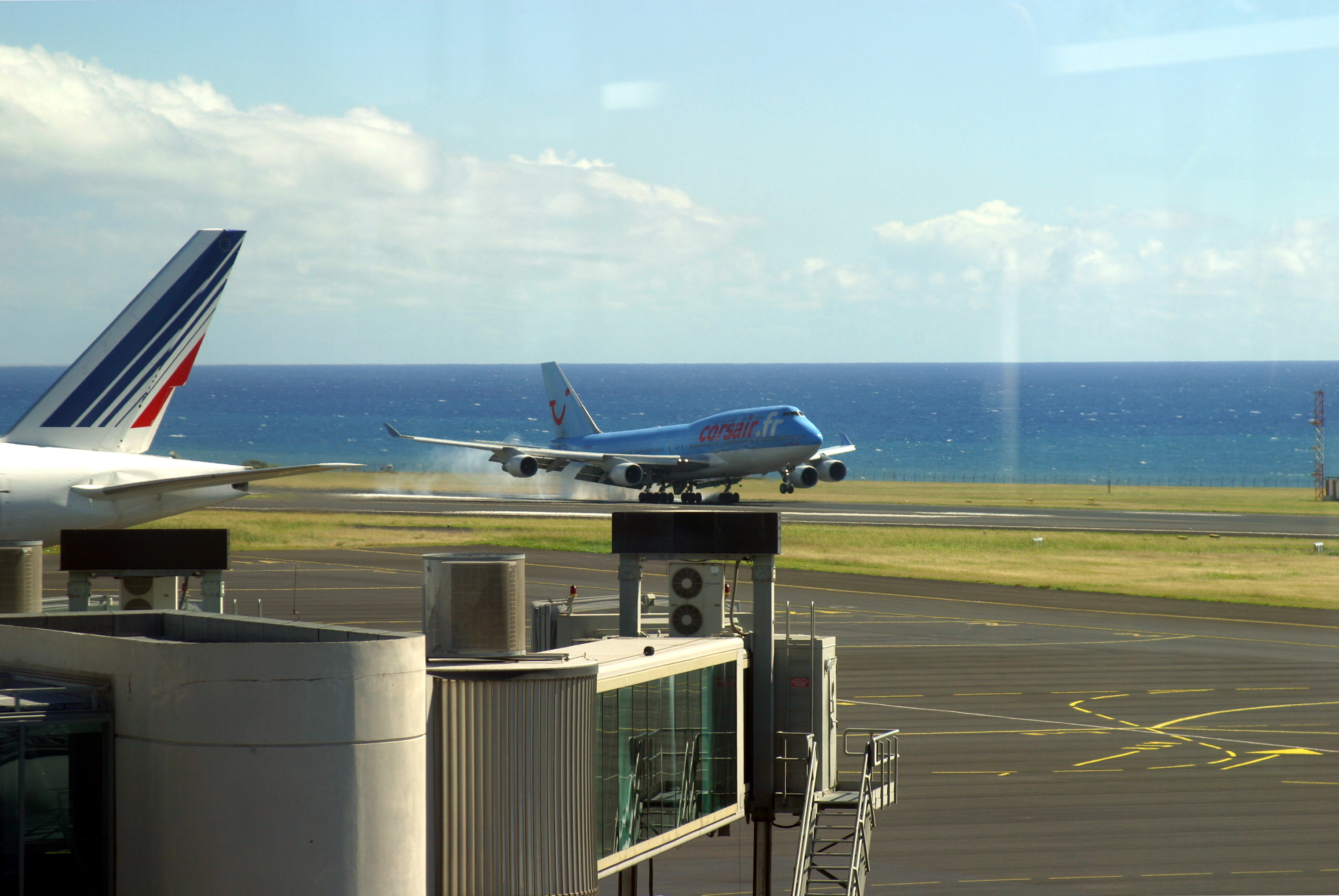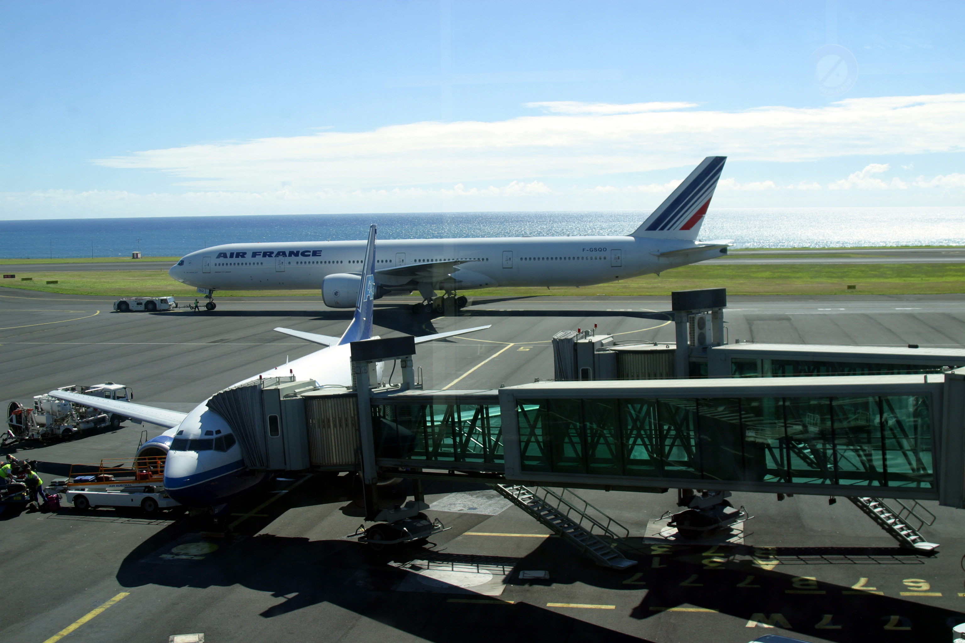 Petit détail technique, cet aéroport a déjà accueilli l’A380 lors d’un vol spécial, mais il semblerait qu’il n’y ait que 2 à 3 mètres d’espace entre le bout de l’aile d’un A380 au roulage et l’arrière d’un 777-300ER garé au contact, ce qui rendrait une exploitation quotidienne de cet appareil assez délicate. Mais je crois qu’Air Austral a finalement gardé les pieds sur terre en renonçant à ses A380, du coup ça ne posera pas de problème à court terme. J’espère qu’ils vont réussir à joindre les 2 bouts car leur gestion a été un peu mégalo ces derniers temps (augmentation des capacités, renouvellement de leur flotte, nouvelles lignes pas forcément rentables, 777-200LR qui n’ont pour l’instant (et tant que les travaux ne seront pas faits à Mayotte) aucune utilité).