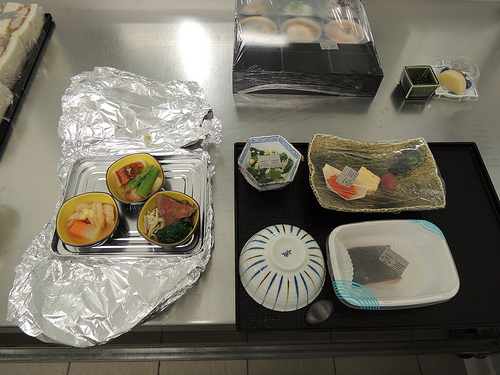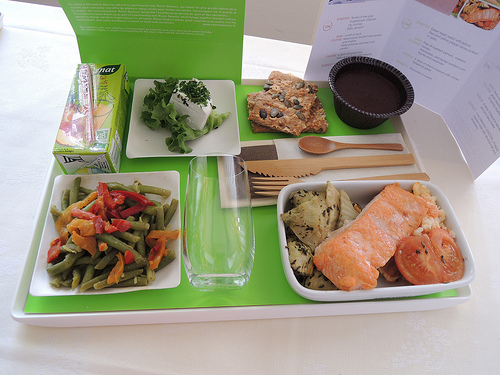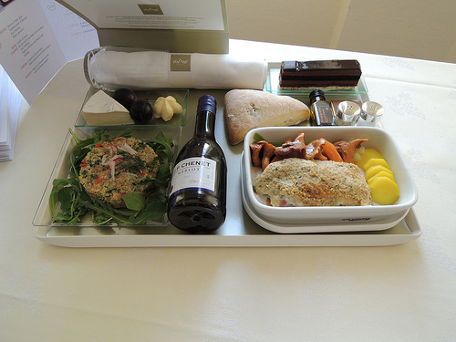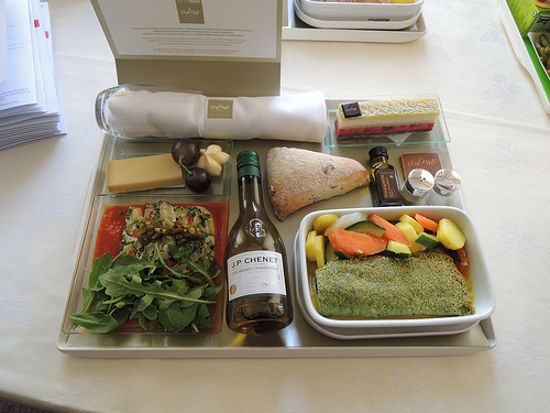 You can see on the pictures that some dishes were here presented in aluminium containers but don’t be afraid, passengers of business classes don’t receive them so. Actually, meals are in aluminium because they need to be reheated by flight attendants who then place them on nice trays with cold dishes.