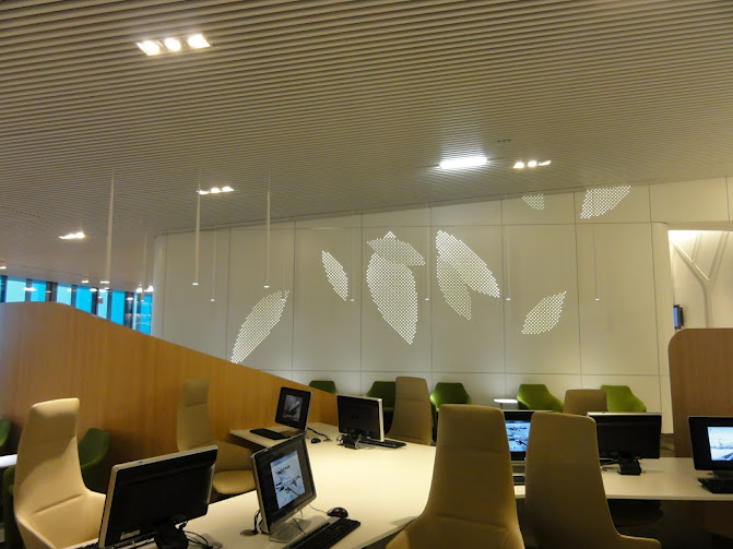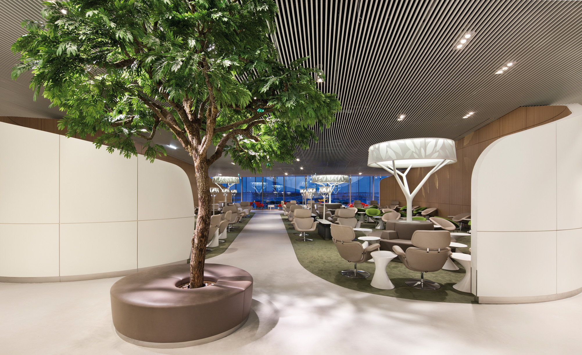 Pourquoi un arbre ? Parce que l’ambiance de ce salon est résolument naturelle, vous transportant dans un jardin alors même que vous êtes dans un aéroport et donc techniquement, aux antipodes d’un lieu calme et reposant. Mais le pari est bel et bien réussi. Dès l’entrée dans le salon, les formes arrondies du mobilier, la moquette verte par endroit et les luminaires en forme d’arbres achèvent de vous amener dans un autre monde, empreint d‘élégance et de volupté.