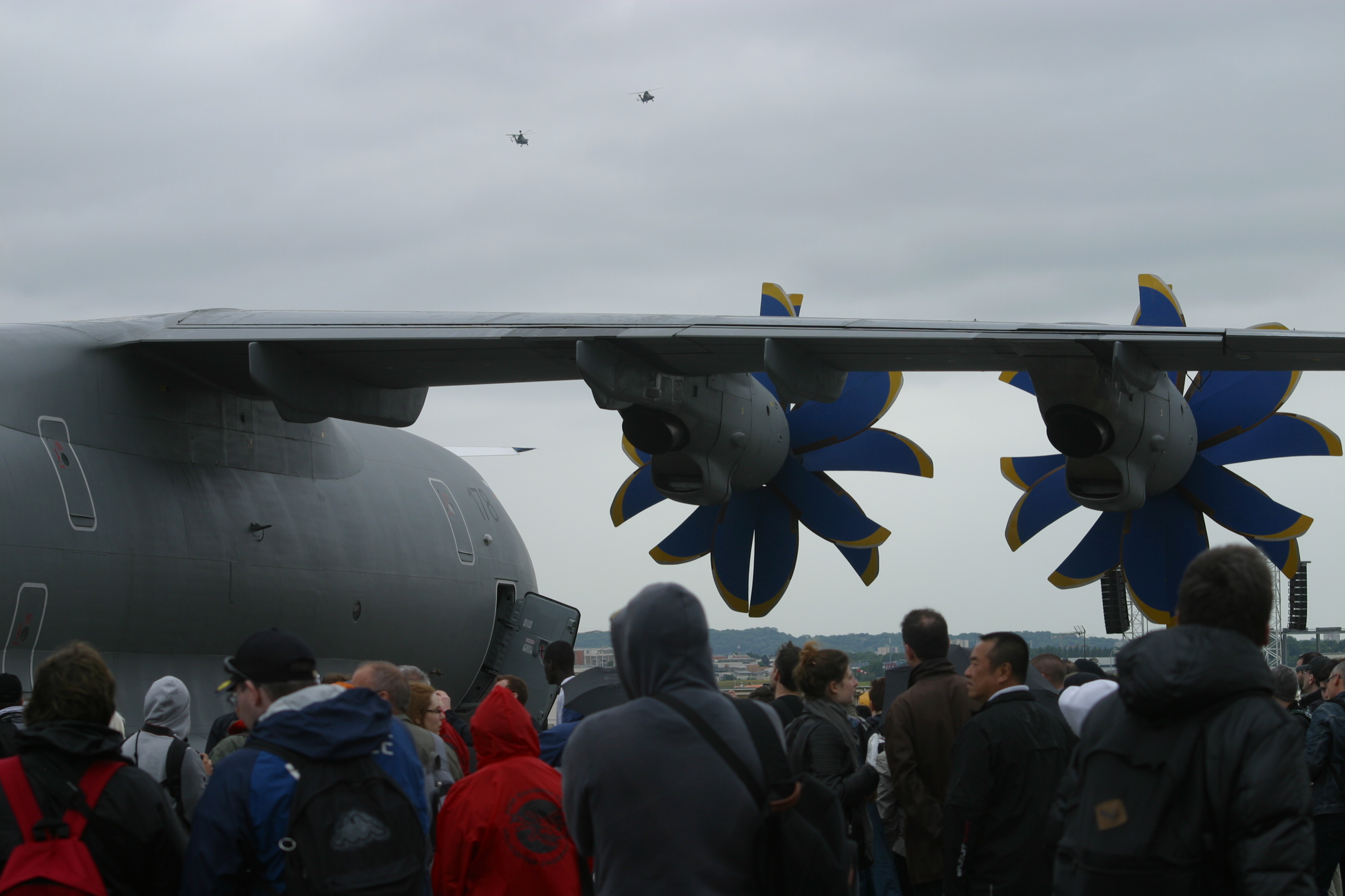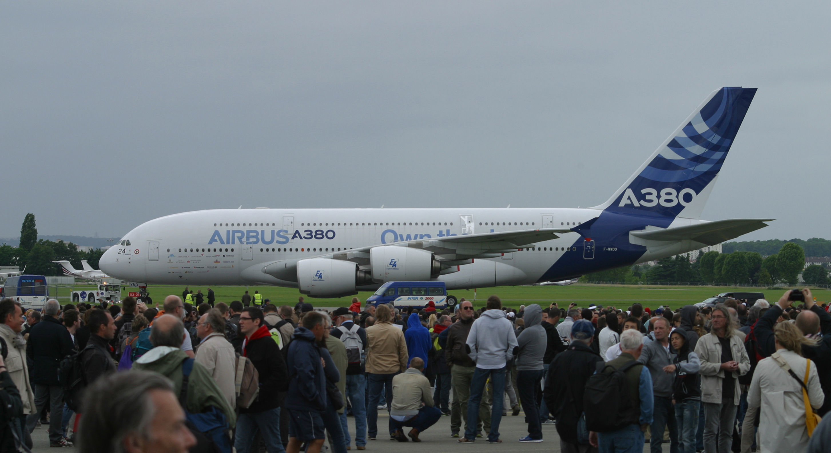 Place ensuite à l’une des vedettes du Salon toujours autant appréciée des visiteurs…l’A380 bien sûr. Le temps de se hisser sur une barrière pour surplomber un peu la foule et c’est parti pour le spectacle du gros porteur Airbus !
