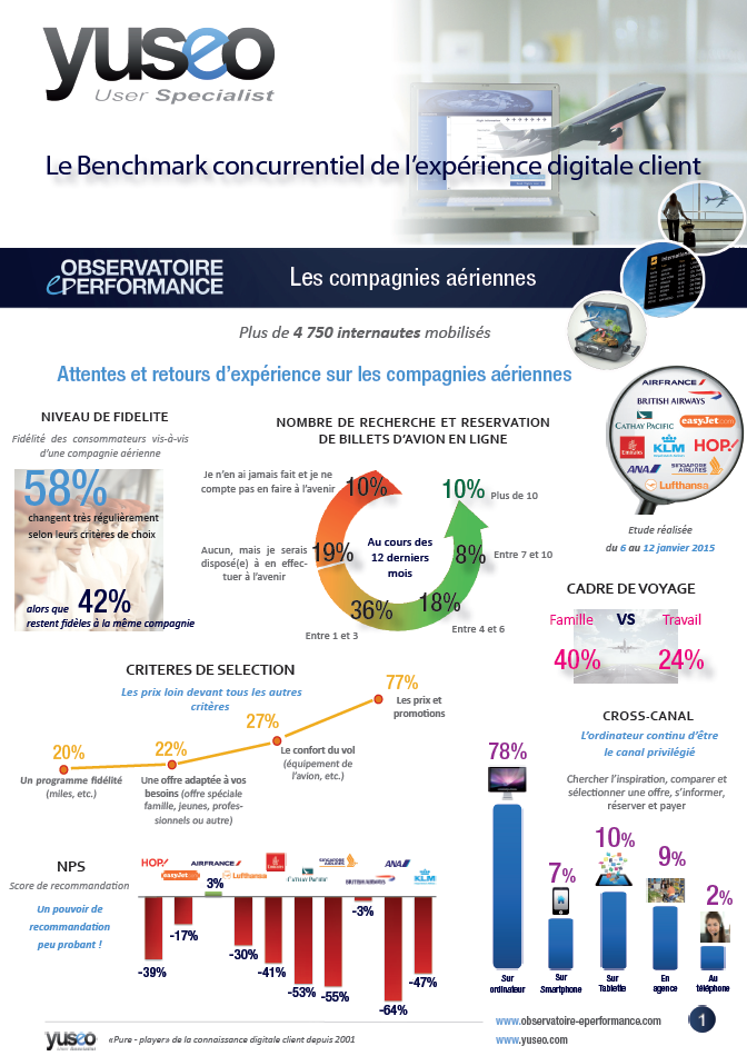 Je vous propose dans cet article de revenir sur une étude du cabinet Yuseo menée en janvier auprès d’internautes sur leurs attentes et retours d’expériences sur les compagnies aériennes. Cette infographie nous en apprend un peu plus sur les habitudes des voyageurs.