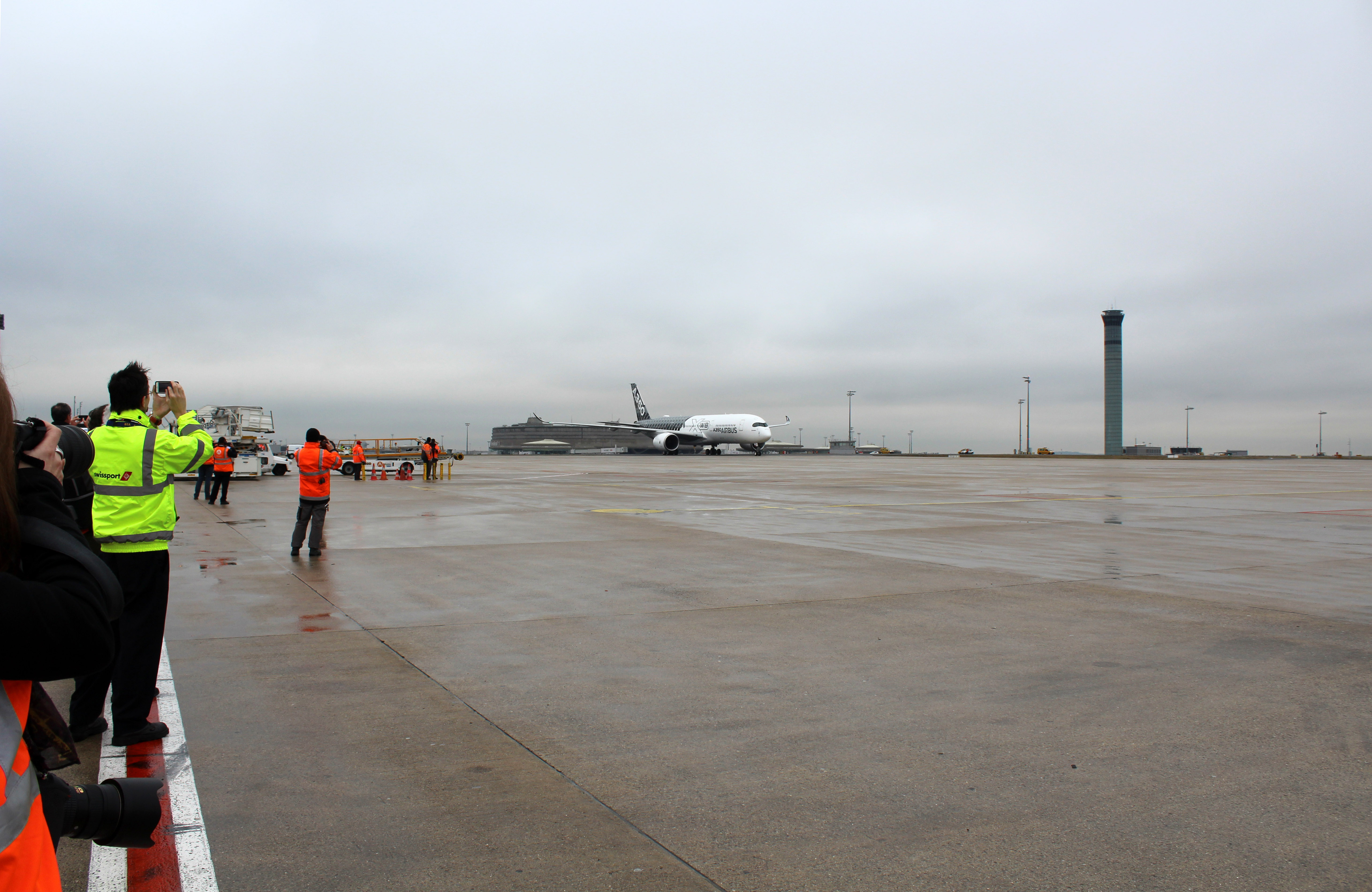 L’impression de grandeur se confirme à mesure que l’appareil se rapproche. Aucun doute, c’est un concurrent du 777 et du 787 ! Arrivé à son point de stationnement, des escaliers mobiles viennent se placer à la 2e porte. Mais inutile d’attendre que quelqu’un ne sorte, les journalistes et personnes d’Airbus présentes à bord n’en ont pas le droit.