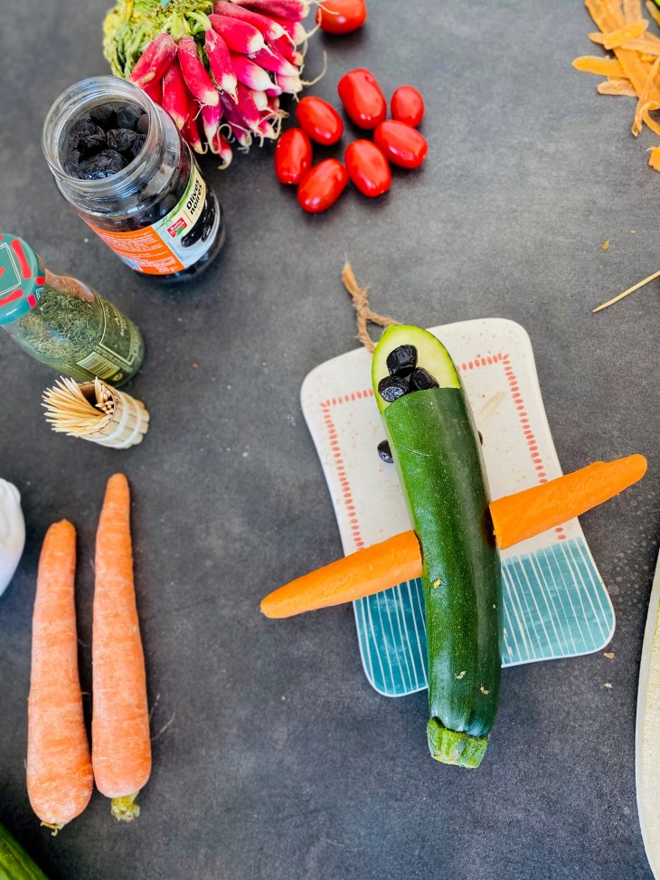 Et l’avion dans tout ça me direz-vous ? Nous vous proposons avec Aurélie de construire un avion… à partir de vos légumes ! Il sera la pièce centrale (et comestible !) de votre apéritif. De quoi vous amuser à le construire, avec (ou sans 😊) les enfants.