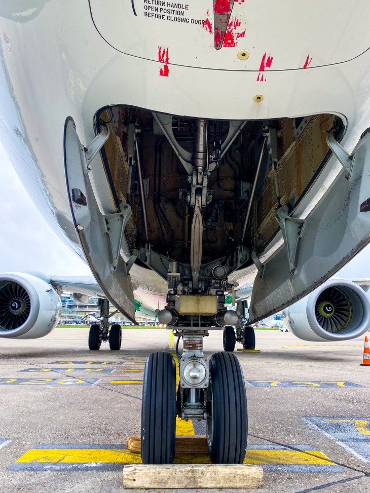 Nous débutons ce tour avion à la descente de la passerelle qui mène à bord, à l’avant et à la droite de l’appareil. On commence par un check :