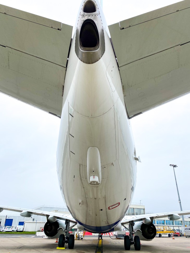 • L’état du patin : vous le voyez sur la 3ème photo ci-dessous, il s’agit de la partie métallique qui « dépasse » sous la queue de l’avion. Ce dispositif est installé notamment sur le 737-800 qui est très long (40m). Lors du décollage, si la rotation – comprendre l’angle d’inclinaison – au décollage est trop forte, l’arrière et la queue de l’avion risquent de frotter la piste, c’est ce qu’on appelle « tail strike ». Le patin est ainsi là pour absorber le toucher. Mobile, il se rétractera et évitera ainsi d’abîmer la structure. Toucher la piste au décollage n’arrive que très rarement voire jamais, mais si cela devait arriver, tout est prévu 👌 Le patin dispose de deux traits (vous le voyez peut-être sur la photo), un rouge et plus petit au-dessus, un vert. Tant que le trait vert est visible, tout est ok. S’il ne l’est plus, c’est que le patin est trop rentré et qu’il faut faire intervenir les mécaniciens.