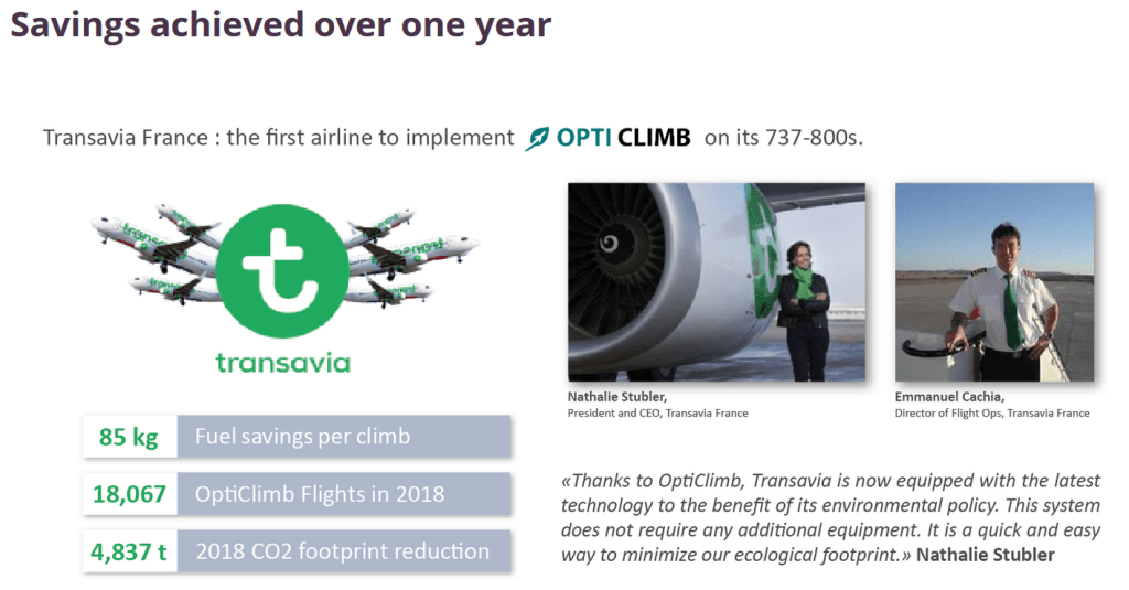 Côté résultats d’ailleurs, les chiffres parlent d’eux-mêmes chez Transavia. Par exemple pour OptiClimb qui fait des recommandations de vitesse lors de la montée : 85kg de fuel par vol ont été économisés. Rapporté à l’année 2018 lors de laquelle plus de 18 000 vols Transavia ont utilisé OptiClimb, ce sont 4,9 Tonnes de CO2 qui n’ont pas été émis 👏👏