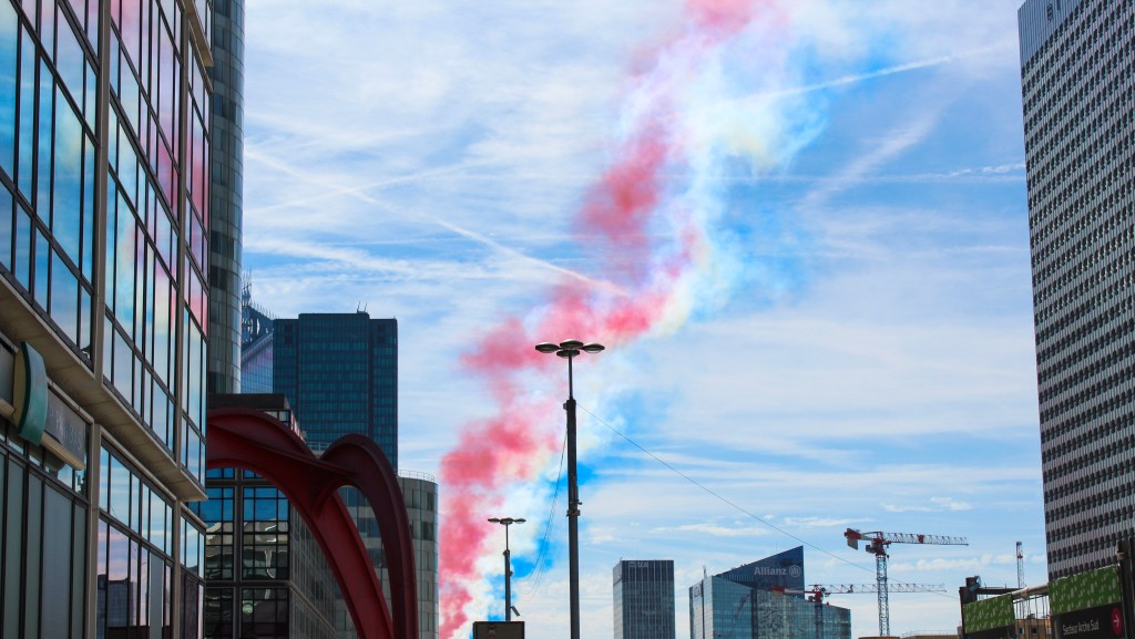 Le placement au niveau de l’Arche permet une jolie vue jusque vers l’Arc de Triomphe. Impressionnant de voir tous ces hélicoptères dans les airs !