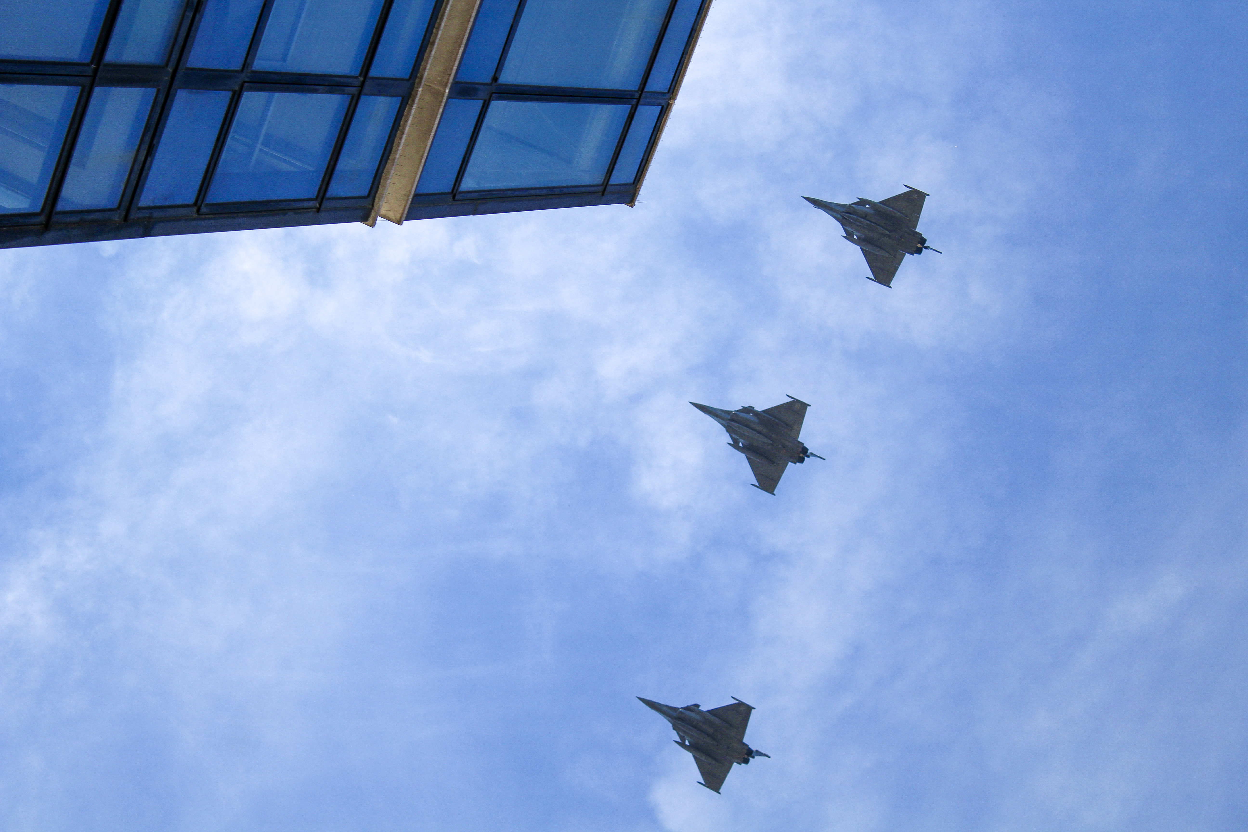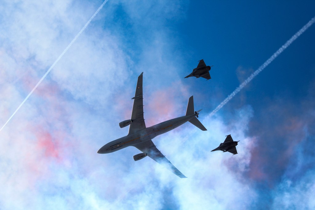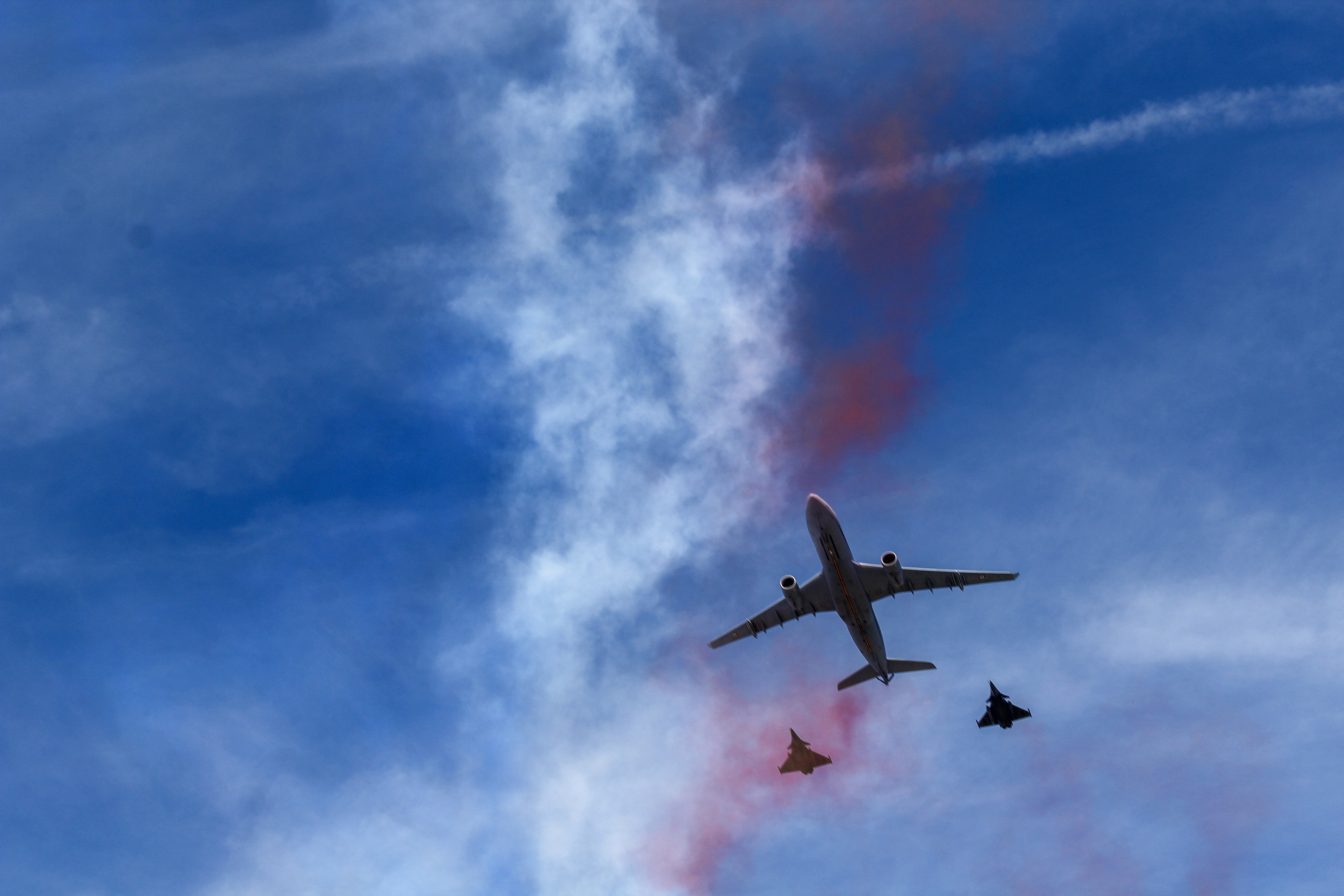 Ils sont tous les 3 passés juste après la Patrouille de France, dont il restait encore en suspension dans les airs des fumées bleu blanc rouge, cela donne un bel effet sur les photos ! Ces appareils sont mobilisés sur des missions de protection des citoyens Français.