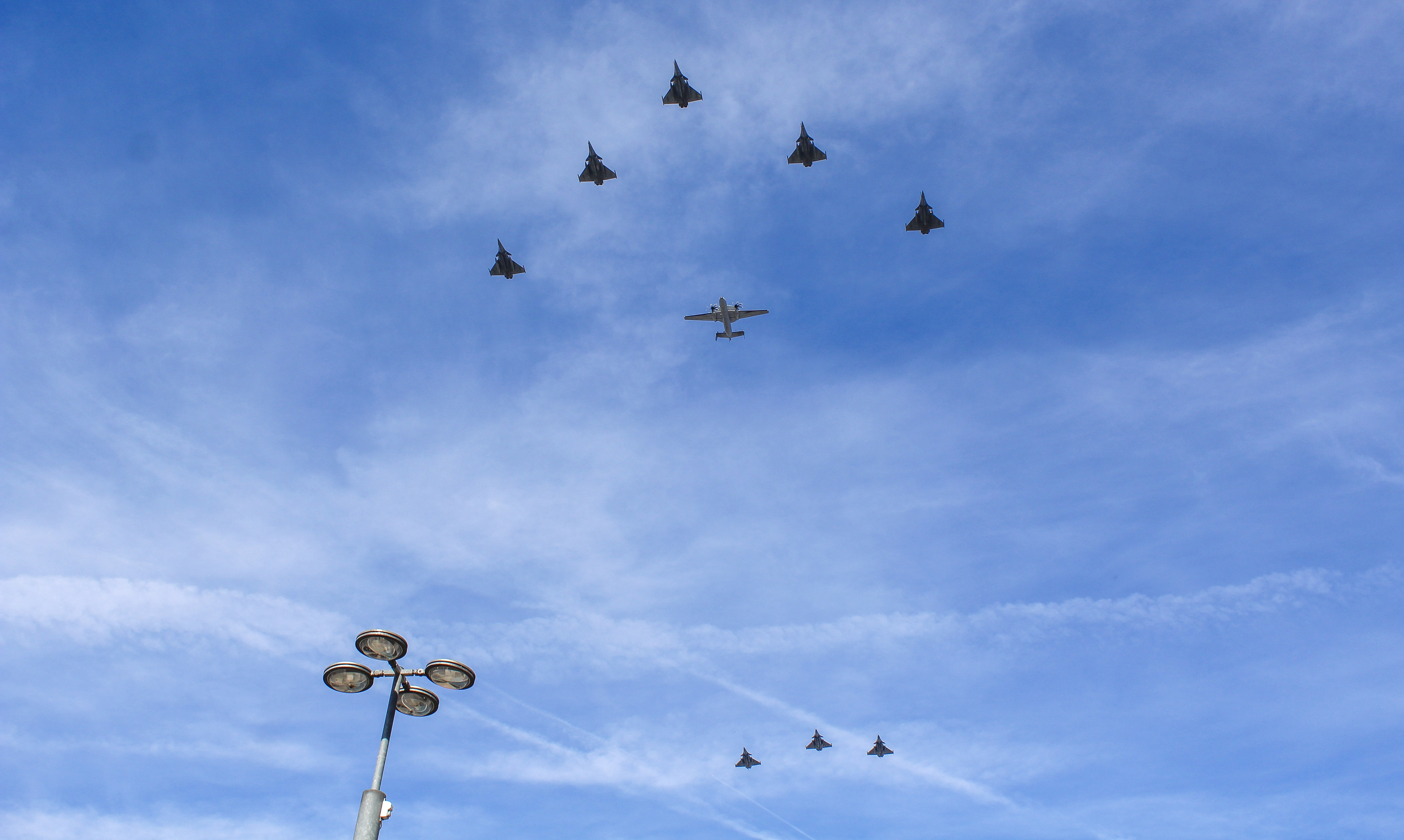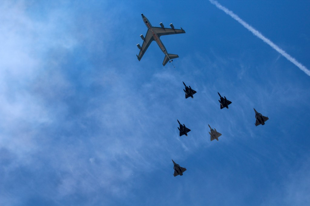 Après les avions de l’Armée de l’Air et de l’Espace, c’est la Marine Nationale qui a pris le relais avec un groupe aérien embarqué, composé notamment d’un Hawkeye au centre. Cet avion de surveillance aérienne est embarqué à bord de porte-avions. Il est entouré ici de 8 Rafales M (M pour Marine, ces Rafales sont capables d’être catapultés par le train avant, depuis le pont d’un porte-avion).