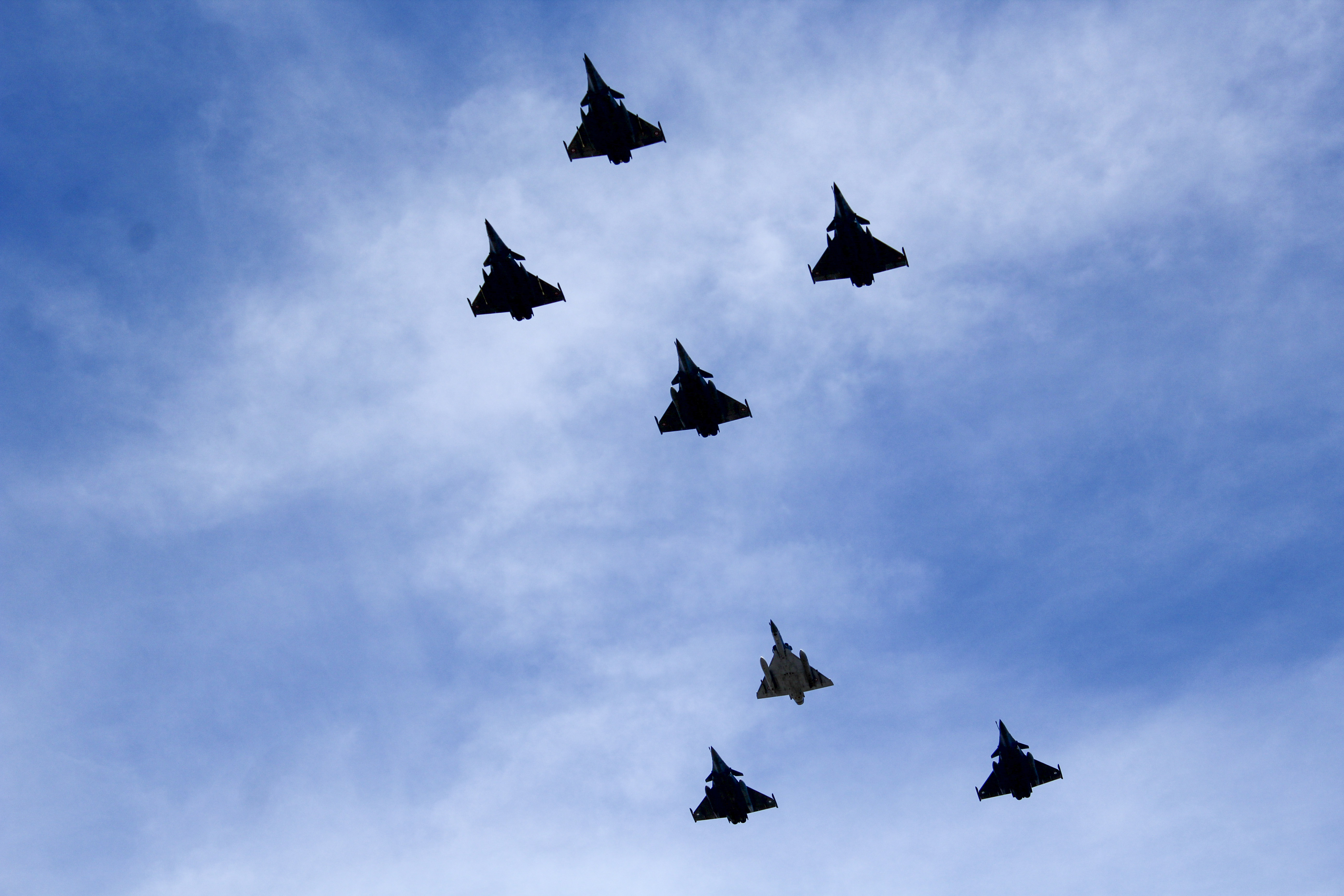 On poursuit avec un passage de la Police du Ciel avec 7 appareils : 6 Rafales et 1 Mirage (le Mirage au milieu en bas de la photo est reconnaissable à sa silhouette différente de ses 6 voisins). La Police du Ciel gère les missions de Posture Permanente de Sûreté Aérienne (PPS-A). Ses équipes sont mobilisées et prêtes à intervenir H24 dans des situations de présence d’appareils militaires étrangers sur notre espace aérien, de détournement, de défaillance technique, de perte de contact avec un appareil ou de toute autre situation représentant une éventuelle menace.
