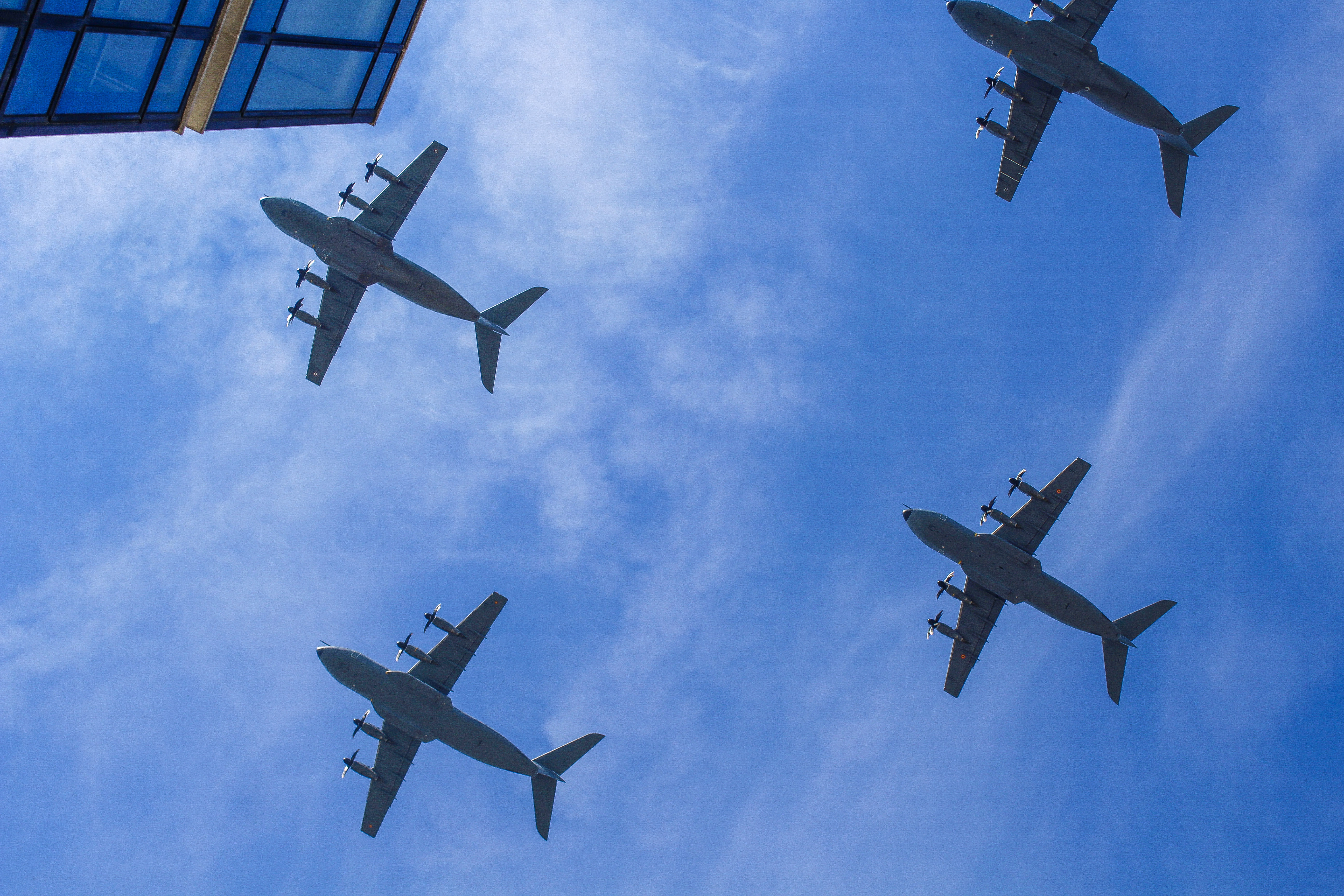Parmi les passages les plus appréciés, celui des 4 Airbus A400M Atlas, très impressionnants par leur taille et leur envergure, surtout à cette basse altitude ! En tête se trouvait un A400M français. Il était suivi de 3 A400M de trois autres pays européens : l’Allemagne, la Belgique et l’Espagne. Ils étaient suivis de 2 Hercules C130. Tous ces appareils sont dédiés à des missions diverses de transport.